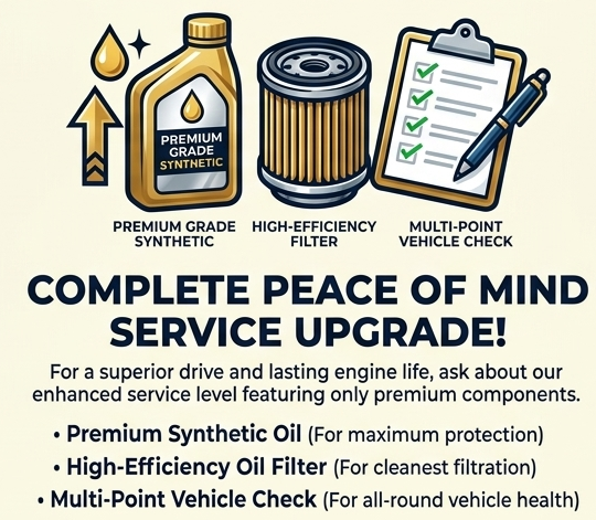 Oil & Filter Replacement: Clearly stating the "up to 6 litres" and new filter inclusion.
